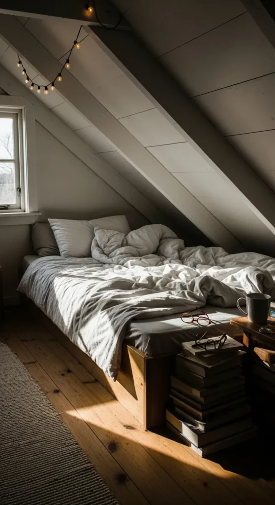 This attic bedroom feels intimate and relaxed with a low warm wood bed frame that fits perfectly under the sloped ceiling. The natural wood tones pair beautifully with soft neutral bedding that looks slightly rumpled and inviting. Exposed floorboards and simple string lights add to the cozy charm, while the small window lets in just enough daylight to keep the space feeling open. Everything feels practical and comforting, like a quiet hideaway made for slowing down.