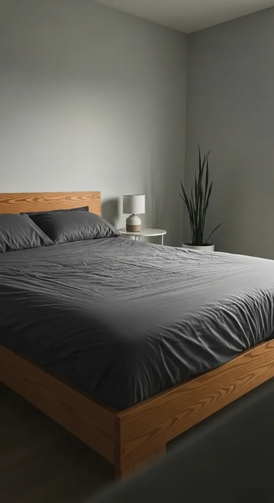 This bedroom feels clean and balanced with a warm wood bed frame set against soft gray walls. The simple shape of the frame keeps the look modern, while the natural wood grain adds warmth and texture. Dark bedding creates a cozy contrast without making the room feel heavy, and minimal furniture keeps the space open and uncluttered. A single plant and a small nightstand add just enough life to keep the room from feeling too stark.