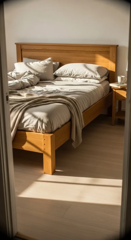 This bedroom feels serene and grounded with a warm wood bed frame that sits low and clean against soft neutral walls. The smooth wood grain adds quiet character while the simple headboard keeps the look calm and uncluttered. Natural light filters across the floor and bedding, creating gentle shadows that make the space feel peaceful and lived in. Minimal styling and a small wood night table keep everything intentional without feeling sparse.