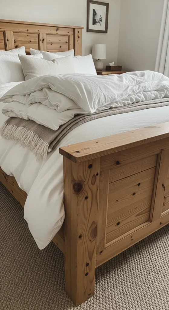 This bedroom feels instantly welcoming thanks to a solid pine bed frame with chunky details and visible knots that give it real character. The warm wood tone pairs perfectly with crisp white bedding and soft layered textures, creating a look that feels cozy without being heavy. Simple decor and a neutral palette keep the focus on the craftsmanship of the bed, while the sturdy footboard adds a classic cottage feel that never goes out of style.